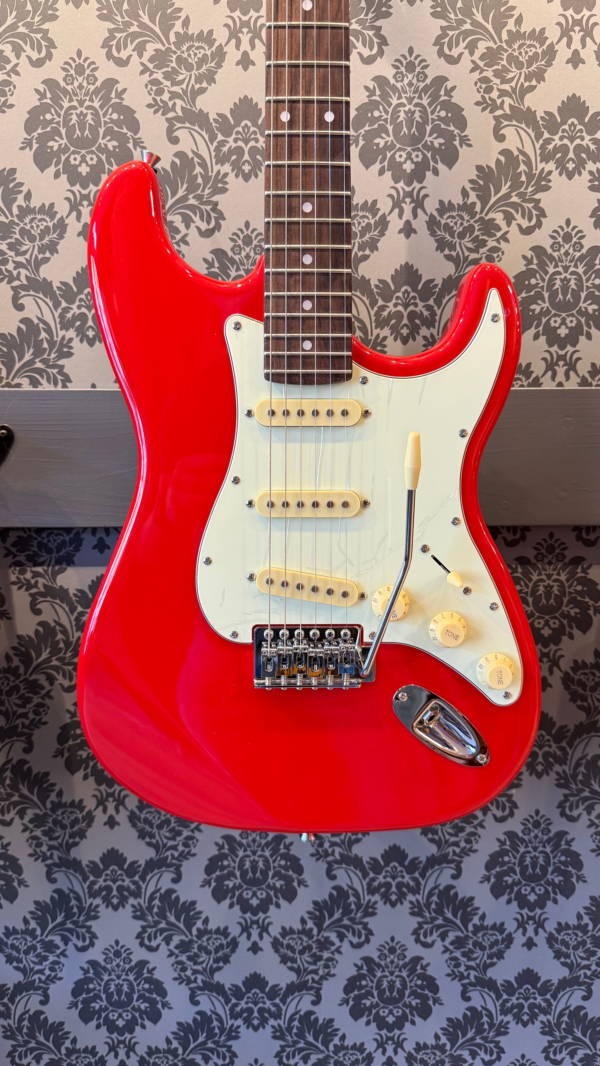 ST-300 Red is the “Tribute” series electric guitar by Eko Guitars with a carbonized poplar body, maple neck and rosewood fingerboard. It is equipped with Eko pickups in S-S-S configuration, Volume, two Tone controls, 5-way blade switch and bridge with tremolo arm.