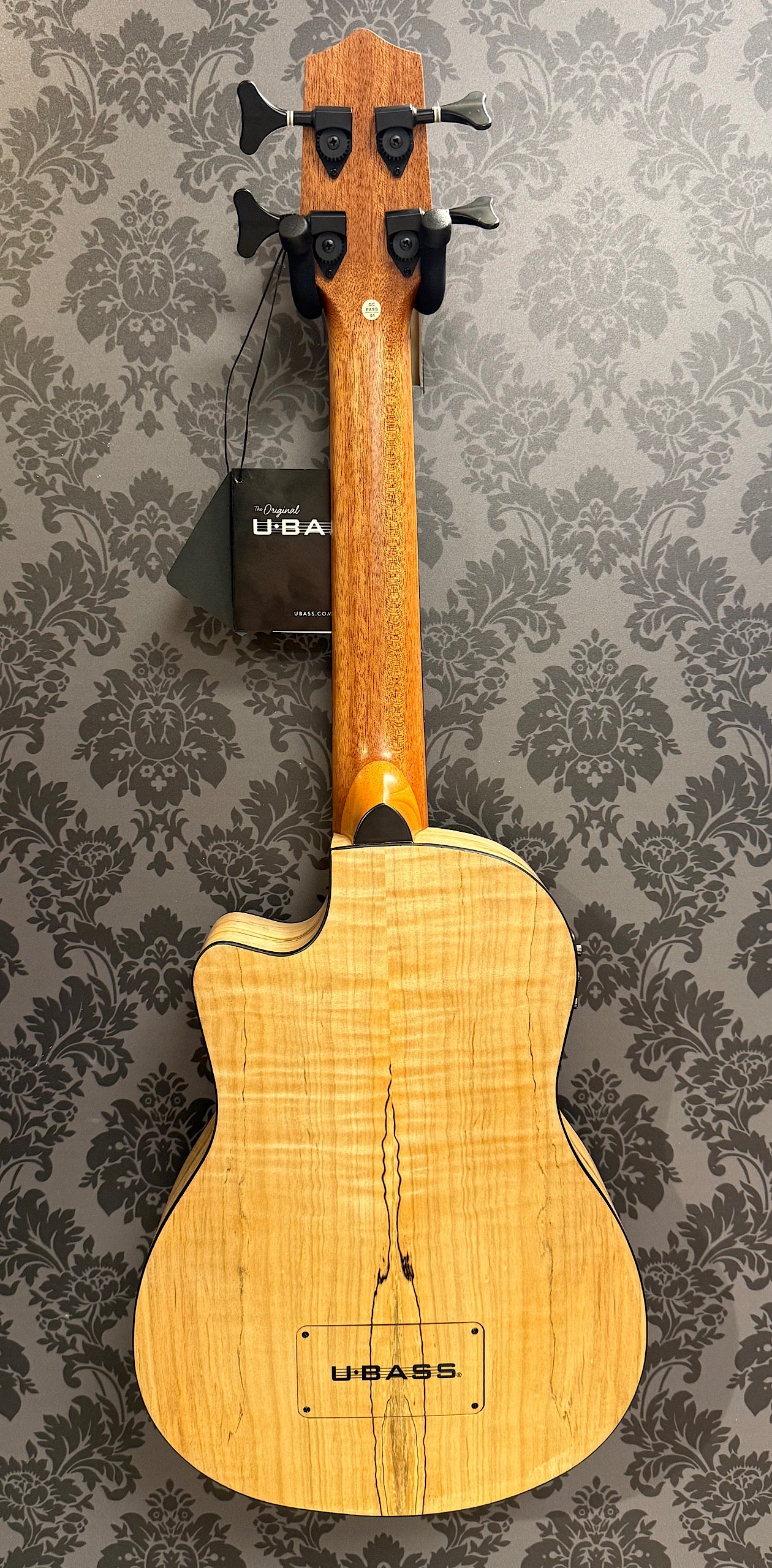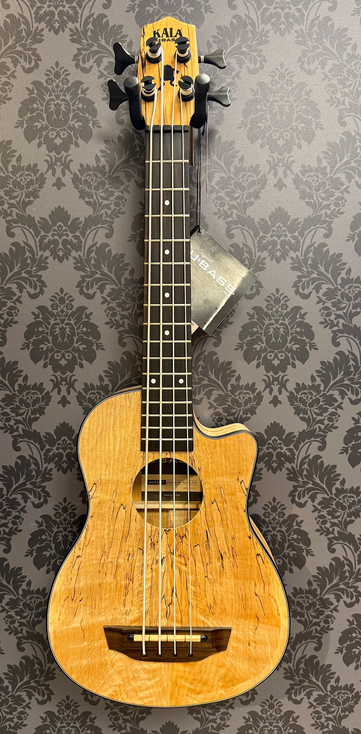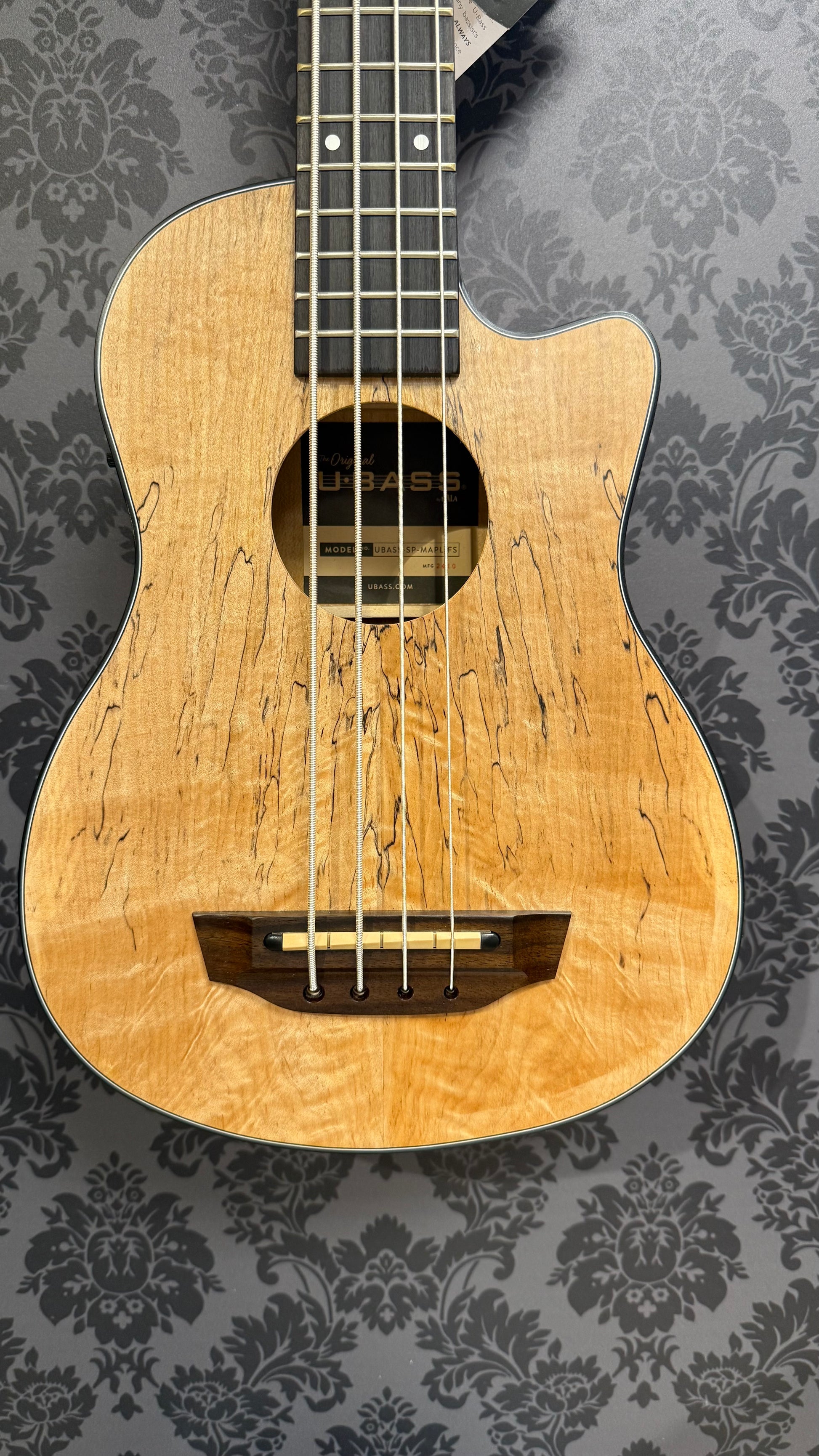 The Spalted Maple U•BASS® has spalting in the wood that resembles fine point pen scribbles forming wavy black lines and streaks that contrast beautifully with the lighter colored, two-tone Maple. Black binding adds a nice compliment and ties into the spalting. This U•BASS® has great dynamic range, clarity, tight lows, and ample sustain. Available in a fretted model.MeasurementsScale Length: 20.8125 inches, Overall Instrument Length: 29.375 inches, Body Length: 13.75 inches, Number of Frets: 16, Width at Upper Bout: 7.625 inches, Width at Lower Bout: 10.375 inches, Width at Waist: 6.6875 inches, Body Depth: 3.0 inches, Fingerboard Width at Nut: 1.75 inches, Fingerboard width at neck/body joint: 2.1875 inches