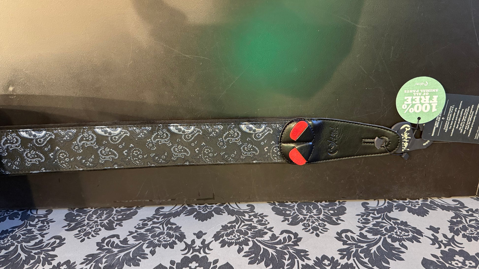 Paisley Black Guitar Strap: The "paisley" design originated in ancient Persia, where it was known as "boteh", symbolizing life and eternity. Its popularity in the West grew during the 19th century, when cashmere fabrics with this pattern were imported from India. The name "paisley" comes from the Scottish town of the same name, famous for producing imitations of these textiles. Since then, it has been a recurring motif in fashion, associated with bohemian and vintage styles.